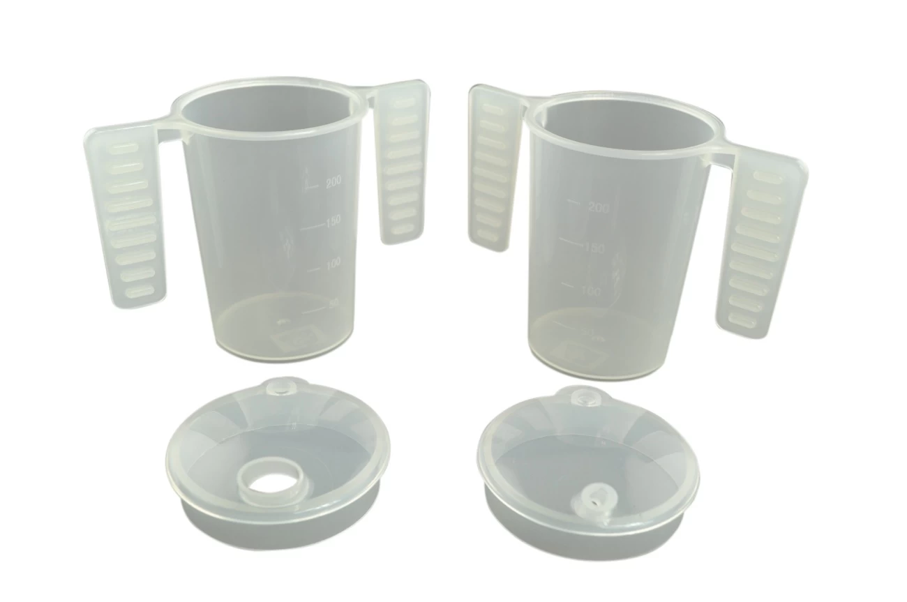 This drinking cup has long and flat handles. Two spout lids are included. One lid with a narrow opening and one with a wide opening.