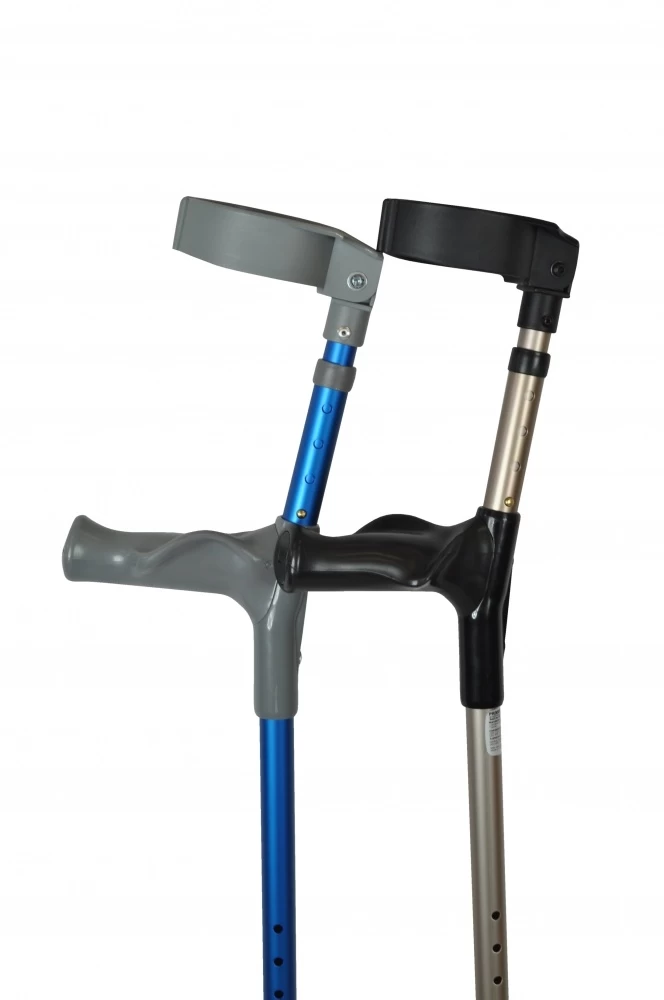 These forearm crutches have an anatomical soft grip. The crutches support the palm and distribute the pressure. The stool and the armrest can be individually adjusted in height.