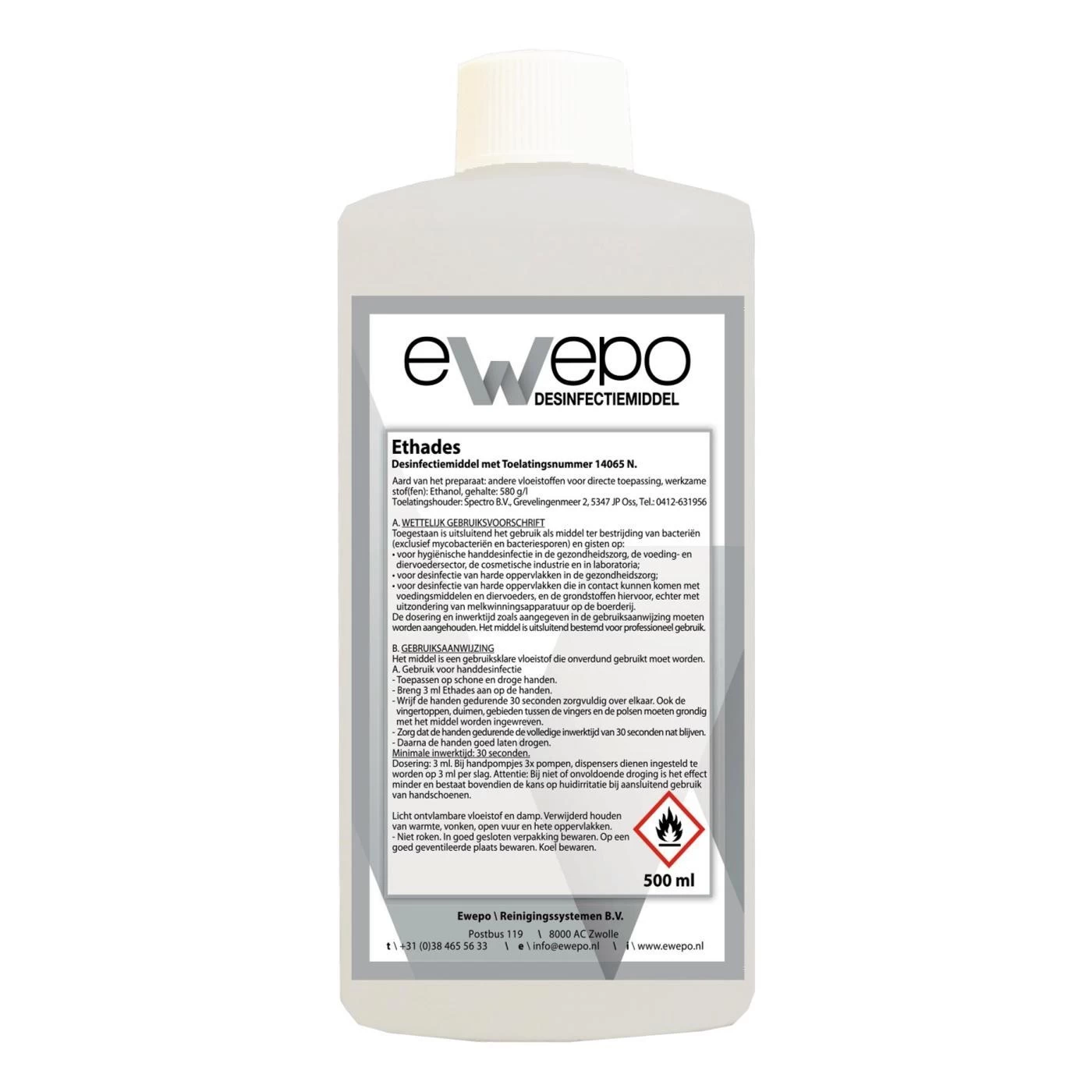 Ethades is a multifunctional product suitable for disinfecting the skin and surfaces. Ethades is based on the purest ethanol (70%) and dries streak-free. Ethades is a skin-friendly alcohol-based disinfectant. Use biocides safely. Read the label and product information before use. Permitted under number: 14065 N. A. LEGAL USE INSTRUCTIONS Only use as a means is allowed to combat bacteria (excluding mycobacteria and bacterial spores) and yeasts: for hygienic hand disinfection in healthcare. the food and feed sector. the cosmetic industry and laboratories; for disinfection of hard surfaces in healthcare; for disinfection of hard surfaces that may come into contact with food and feed. and the raw materials for it. however excluding on-farm milking equipment. The dosage and exposure time as indicated in the instructions for use must be adhered to. The product is only intended for professional use. Content 500 ml