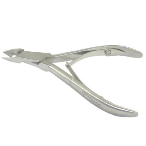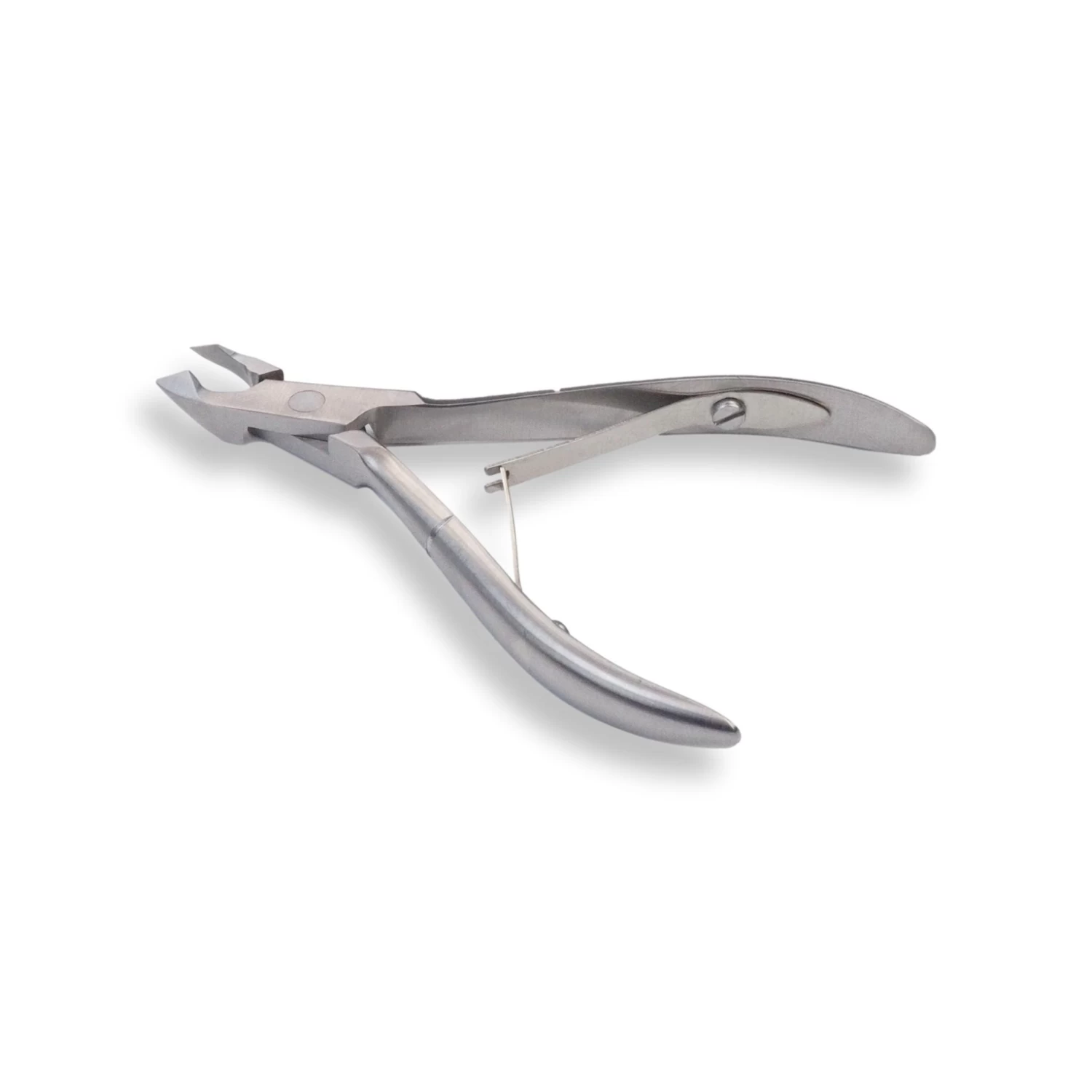 Stainless steel felling tongs 10 cm. Small pliers with cross spring to cut away skins close to the skin. The jaw of the forceps is 5.5 mm long.