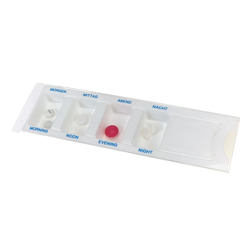 Medication pill dispenser medicine box for daily use with transparent sliding lid.