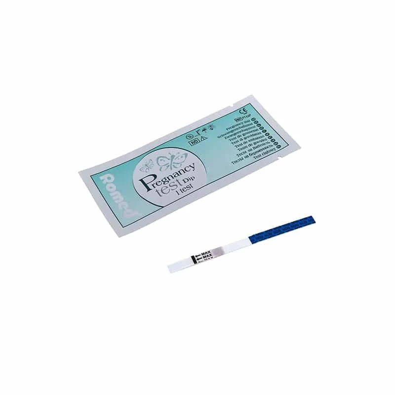 Romed dip test 1000 pieces The Romed pregnancy test dip test is a reliable and economical way to determine a pregnancy. The test result can be read within a few minutes. With 1 line on the pregnancy test you are not pregnant, with 2 lines you are pregnant. – reliability of 99.9% – easy to use – Dutch manual – extra sensitive and accurate Contents: – 1000 pieces