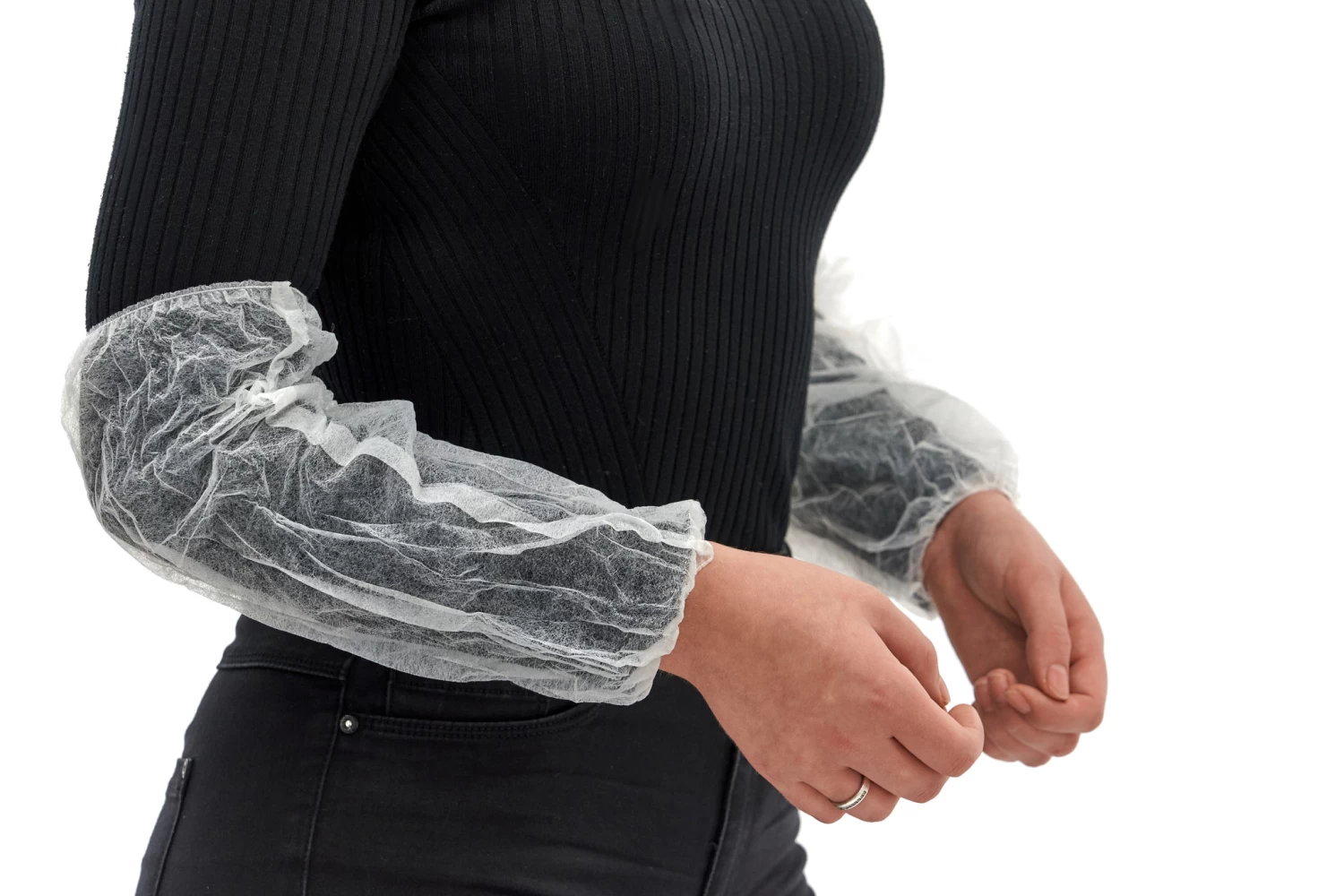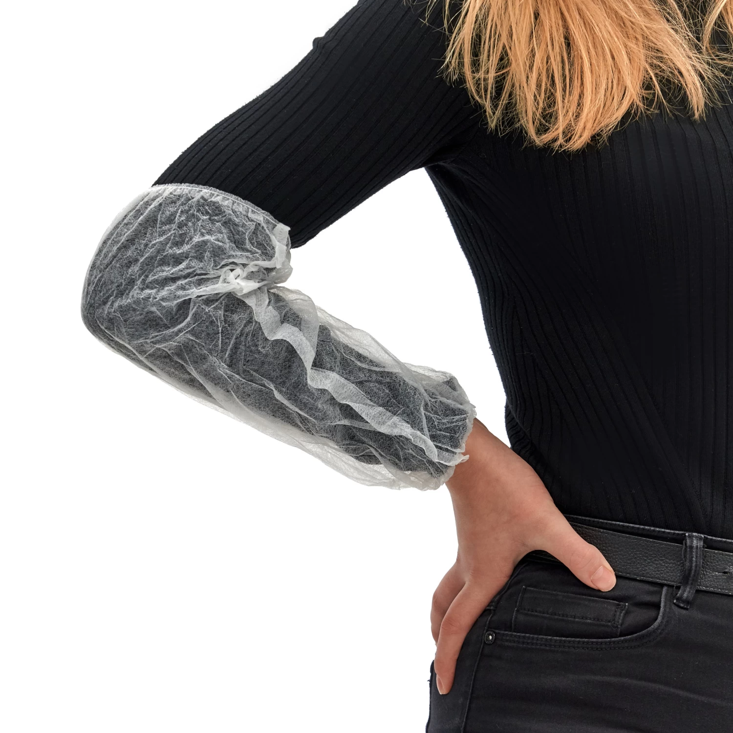 The sleeve cover protects the arms against splashes or other contaminants. Packed in plastic bag. sleeve covers white non-woven
