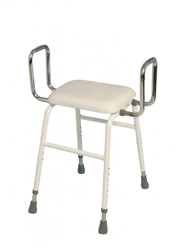 This versatile stool can be used in 4 ways. As a sitting stool, sitting stool with backrest, sitting stool with armrests and complete with armrest and backrest. Is made of plastic coated steel tubes.