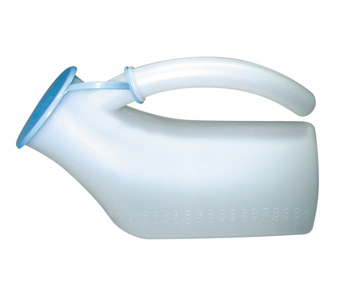 This milky white urine bottle with blue cap has a handy handle. Easy to empty and ideal for bed. Not autoclavable.